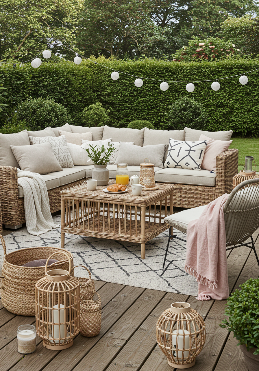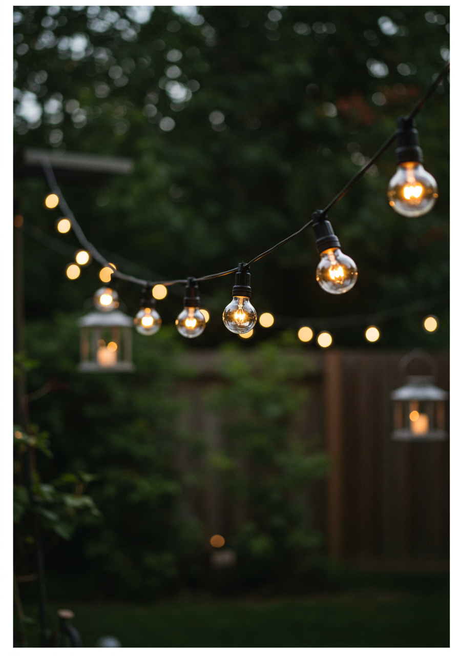 One way to embrace outdoor living and make your space an extension of your living room is to invest in additional lighting. Luminous decorations, such as floor or table lamps and lanterns, will not only brighten up your backyard but will also add interest to it. Just make sure to choose lamps that are designed for the outdoors and are weatherproof. Another brilliant idea is hanging pretty string lights across an entire space or along a fence to give your yard a rustic vibe.